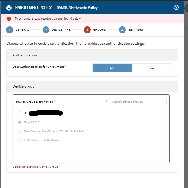 I was renaming Groups in locations and now when I try to enroll a device it fails and I notice I cannot select a group from within that profile.