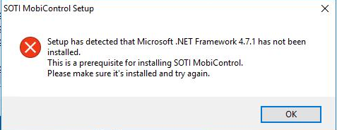 We were trying to update the SOTI MobiControl on our server with version 15.1.1.1184, but it gives an error message at the beginning: