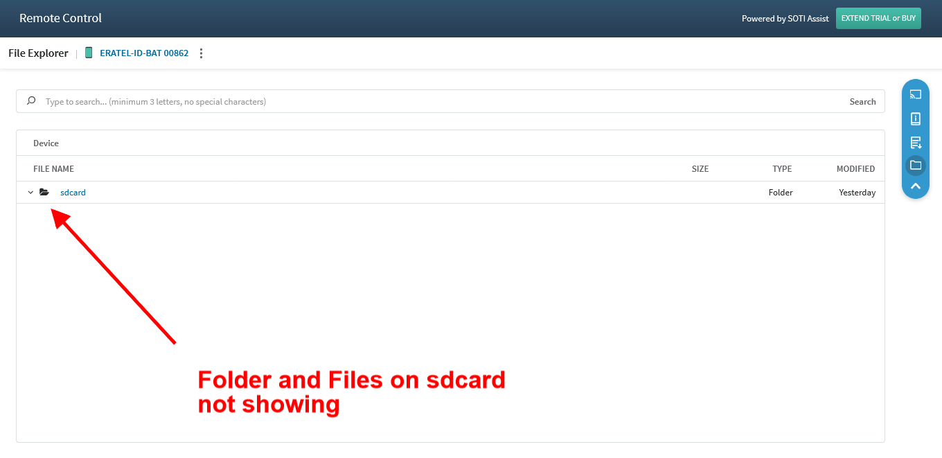 if I remote the device and open the files manager application, we can see the folders and files in the sdcard. but in soti does not appear.