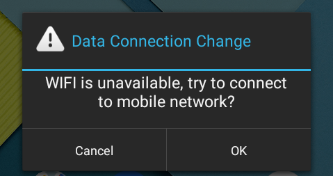 I get the following notification when the WiFi is unavailable and I have a SIM-card on the device. Is it possible to use automatically mobile network without asking about it? Before the prompt the mobile data appears to be on (the ISP name is shown).