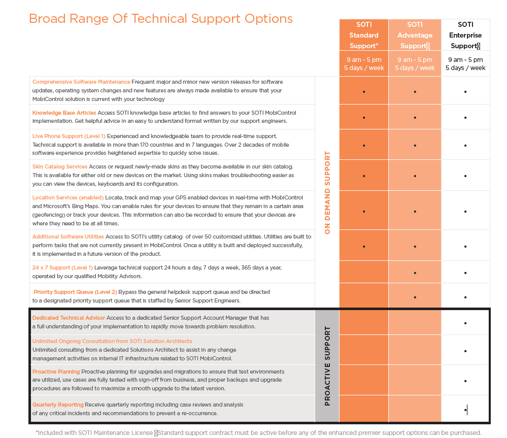In addition to SOTI’s standard support plan, we offer two levels of premium support; SOTI Advantage Support and SOTI Enterprise Support. Our premium support offerings provide a dedicated priority support queue that is available 24x7. The SOTI Enterprise Support level includes a dedicated Technical Advisor to provide proactive support.