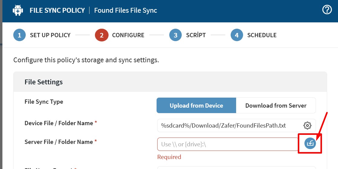 The documentation states that the complete path can be entered in Server File / Folder Name.