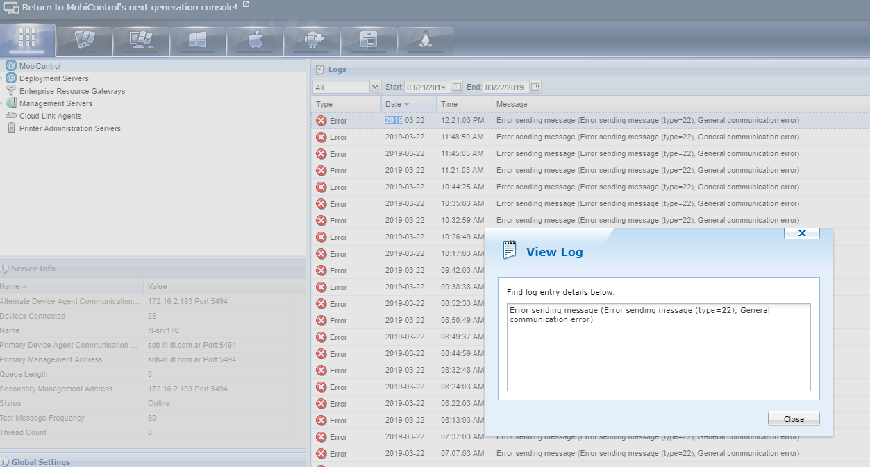 Hello Ivan - Could you please let us know if you are still experiencing the Gateway Time-out Error? Please share with us the details at support@soti.net and someone from our technical support team will assist you.