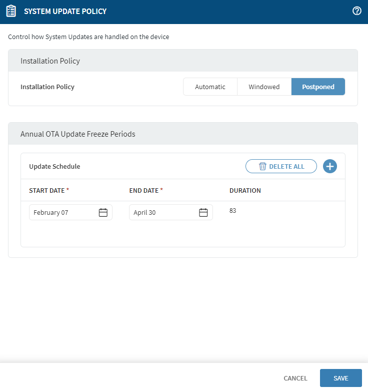 I have a Samsung Tab A7 lite on android 12. We currently have a profile with a lockdown and System update policy. The policy is set up to postpone software updates from February 7th to April 30th. Today, Feb 21st I had a device prompt me to update to Android 13 while in user mode. It looks like the update went through. We are trying to avoid and postpone Android 13 for the time being. Can someone take a look at our Update Policy and insure we set it up correctly? I have an spoken with a Soti rep during the set up of the policy and at the time he said it looked good.