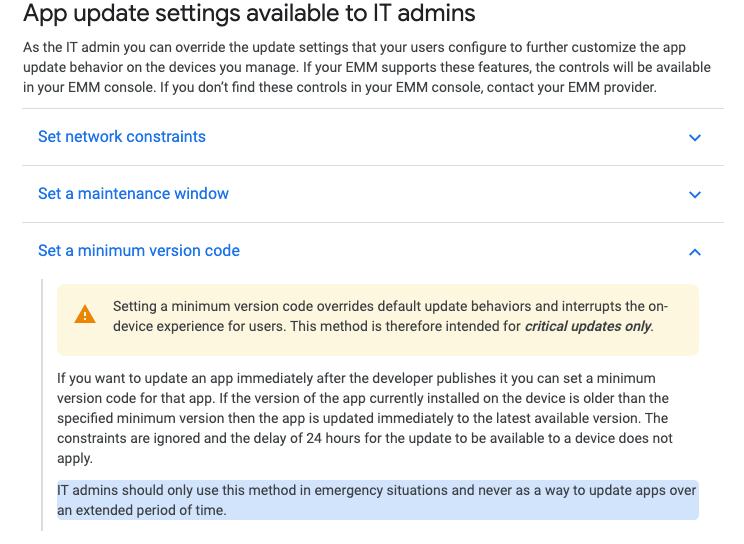 I  have yet to find a way to use SOTI to automate this process however. Android Enterprise supports a concept of a Minimum App Version in Managed Play to force emergency updates but it doesn't appear that MobiControl has implemented this control.