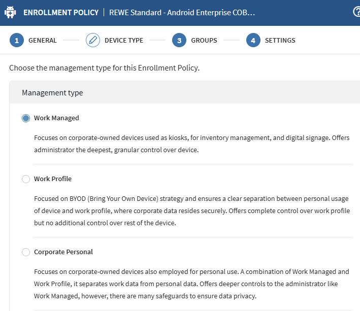 We have set the Device Type option in our Enrollment Policy to "Work Managed" as we only want fully managed devices in our MDM.