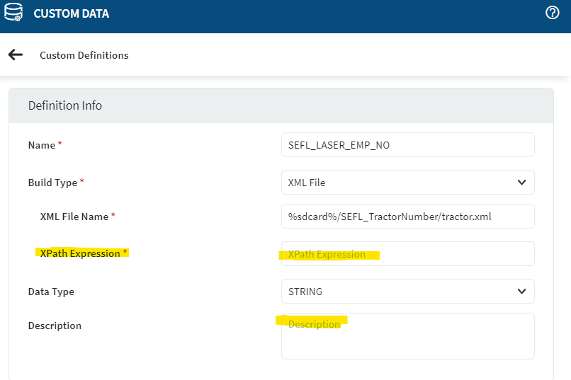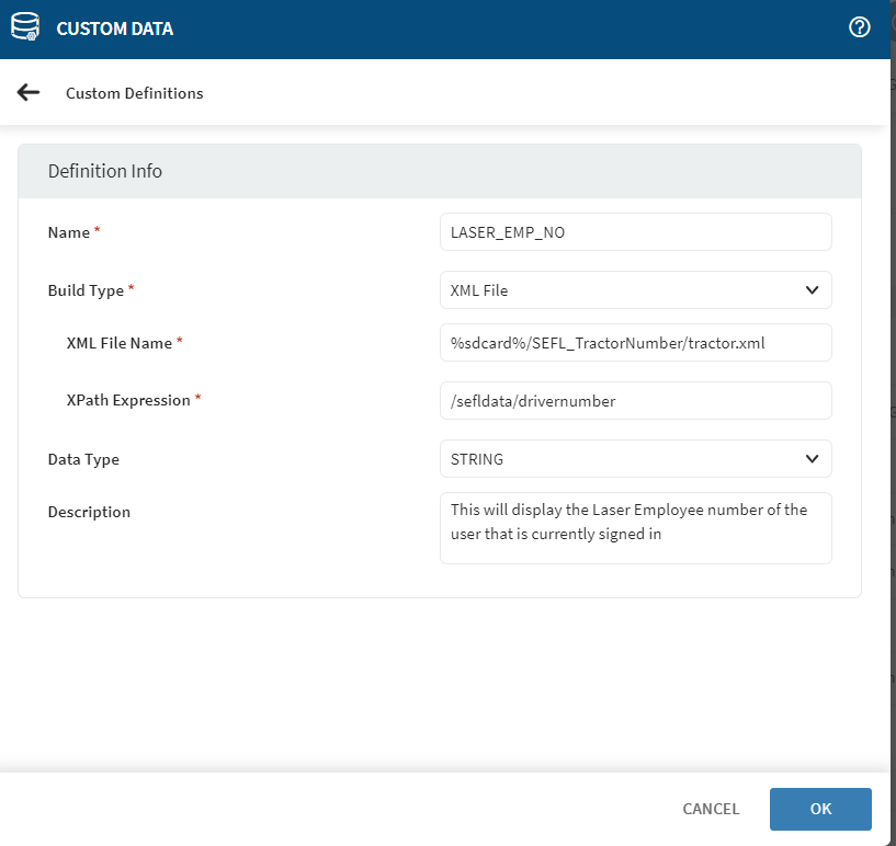 I am setting up a custom data field using xml file that is already syncing to our devices to pull the information and I'm not sure how to pull this information from the xml file into SOTI to display in the details page. what do I put in the "XPATH Expression" field from the XML file to get the "driver name" to display