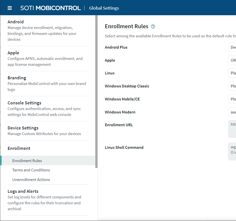 Are you logging in your web-console with a user account in the "MobiControl Administrators" group? If not, please do so and the "Enrollment Rules" tab should be accessible. If already so, you might need to open a support case with Soti support team to see if if there is anything wrong with any MobiControl/Soti-Identity configuration(s), or if there is any need to upgrade your MobiControl server to a newer patched version.