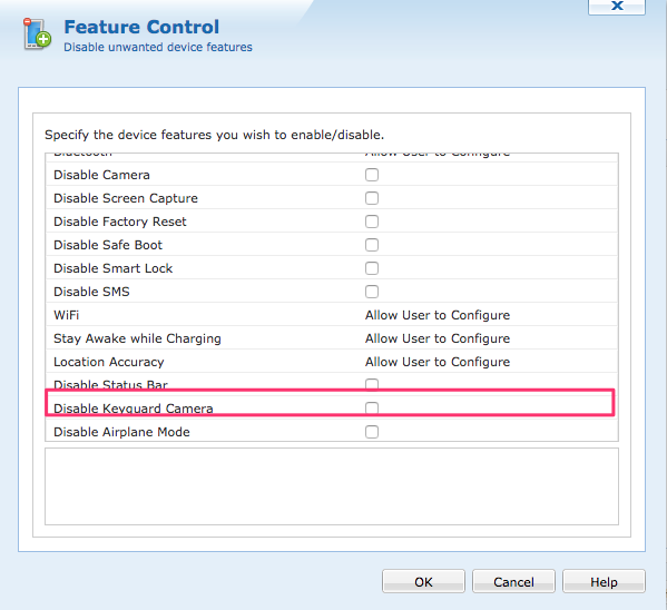 I have a lock down (authentification / html page) on some device, on feature control i have checked disable camera.