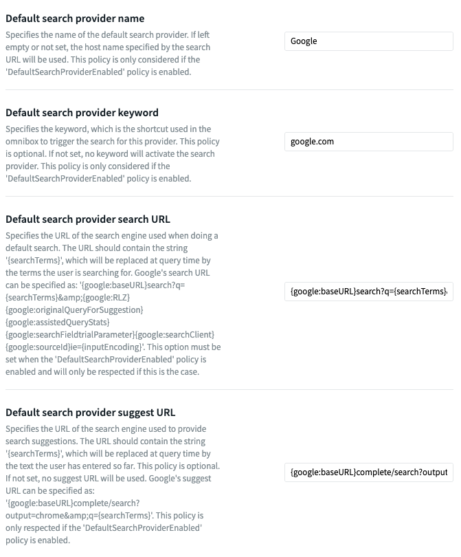 Default search provider search URL: {google:baseURL}search?q={searchTerms}&{google:RLZ}{google:originalQueryForSuggestion}{google:assistedQueryStats}{google:searchFieldtrialParameter}{google:searchClient}{google:sourceId}ie={inputEncoding}