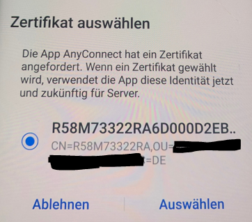 We use Managed Google Play and push CISCO AnyConnect with managed configuration on the device. In managed configuration we set “KeyChain certificate alias” to %SERIALNUM%