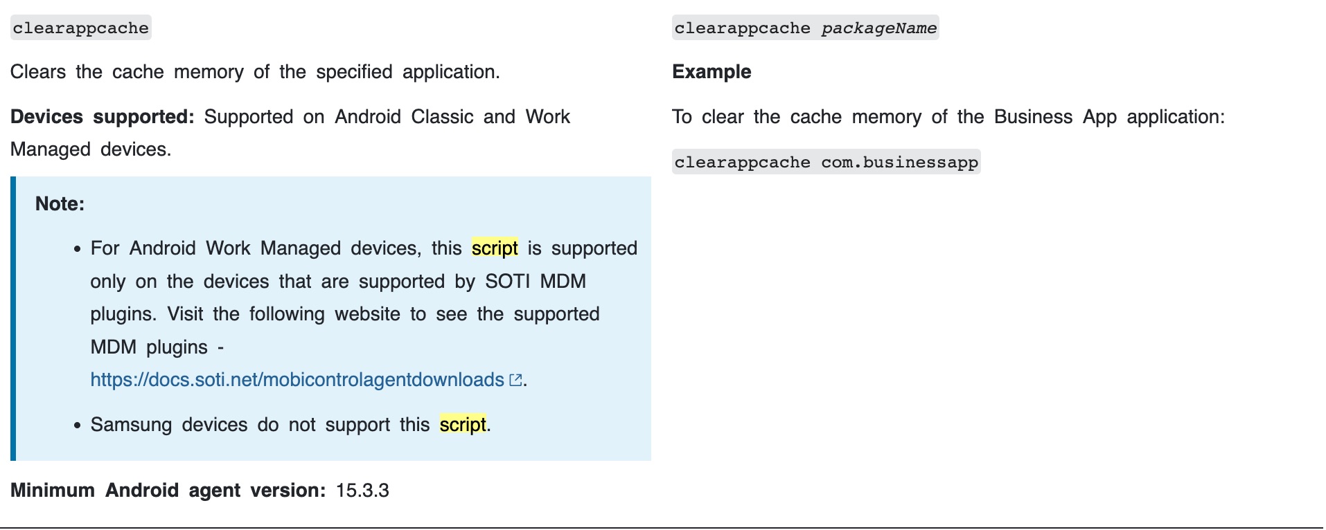 Sending the script will clear cache memory for applications in the device per the package name mentioned in the script: