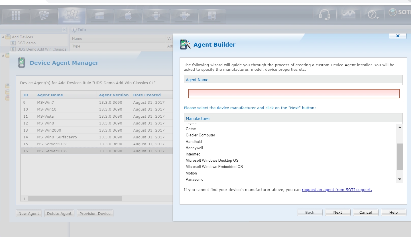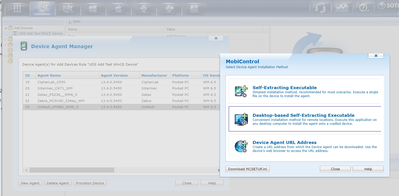 In the MobiControl web console, create corresponding add-devices rule in the target Window Platform tab, click on the rule and select "Device Agent Manager" in the pop-up menu. Click on the "New Agent" button to select vendor/model and configured other parameters to create the required agent, and then the "Provision Device" button to get the required EXE file or URL link for actual device enrollment. While the following screenshots are for MobiControl v13.4, the mechanisms are the same for MobiControl v14.x+.