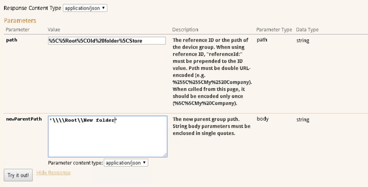 curl -X PUT --header "Content-Type: application/json" --header "Accept: application/json" --header "Authorization: Bearer Very long token" -d "\"\\\\RootFolder\\New folder\"" "https://SOTIServer.com:443/MobiControl/api/devicegroups/%255C%255CRootfolder%255COld%2520folder%255CSourceFolder/path"