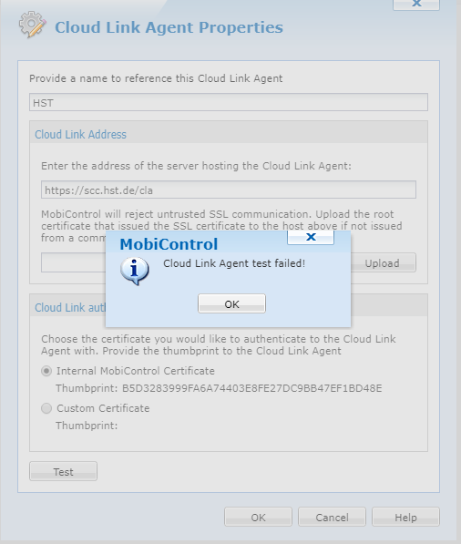 "But when we add the required data to a Mobicontrol cloud and start the test, it fails directly."
