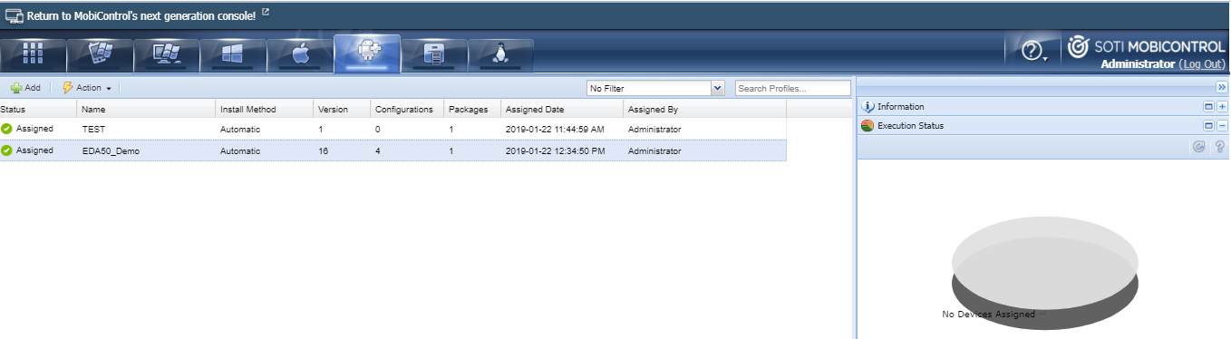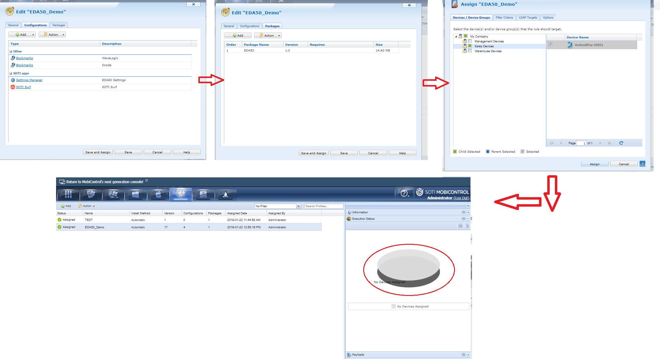 Now i want to send some configurations like SOTI Surf, Lock Down and some apk files (using package) to the devices. For this i created a profile and set all my configurations and set my package in this profile. But when i try to assign this package to my device , these configurations or packages doesn't get reflected in the devices. Also the dashboard shows that "no devices assigned".
