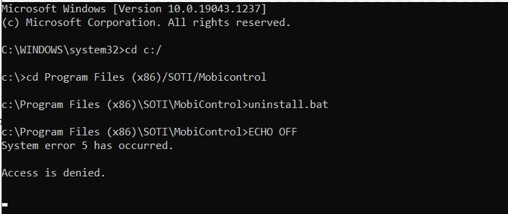 I can't seem to successfully execute the Uninstall.bat file from the MobiControl folder for Windows Classic