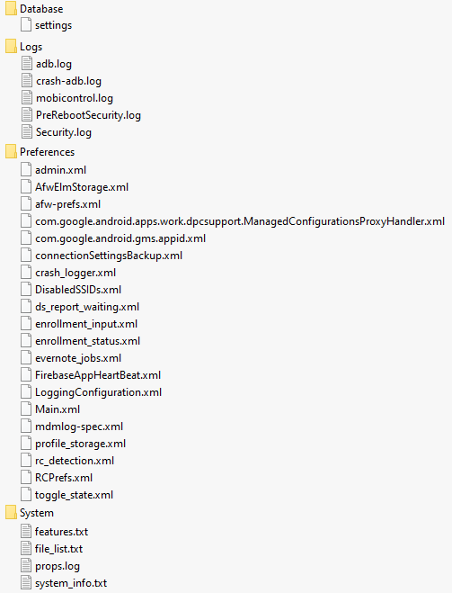 This script ask the device agent to send a debug report (all following files) to the SOTI FTP server through the port 22 and without passing through the MC server (DS/MS).
