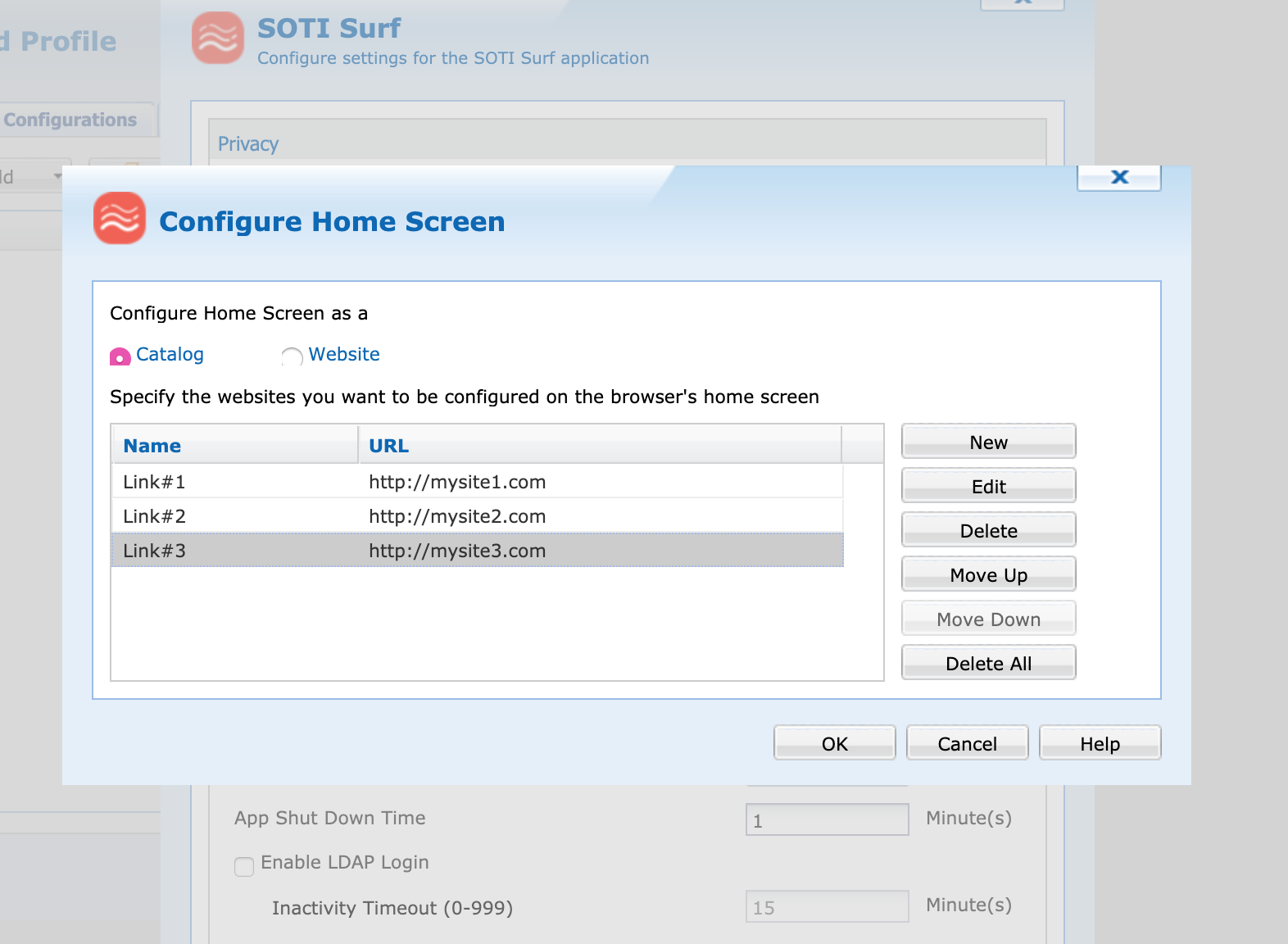 You may be better off just having a single launcher option to open SOTI Surf and then define a catalog of bookmarks within SOTI surf to each of your three sites. That way users can tab between each of the available sites while within Surf rather than launching a new tab each time.