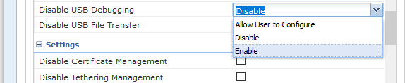 I mean Developer Options in Settings via feature control profile maybe (not Disable USB Debugging)