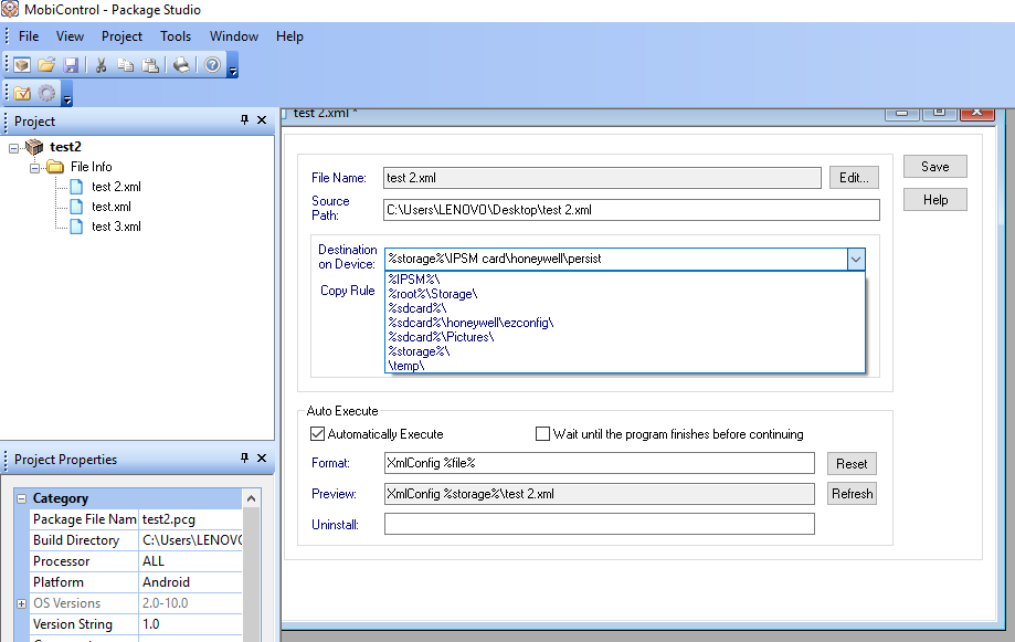 I exported this xml using Honeywell EZ config. In order to put this configuration in other devices, i have to place this xml in the 'Storage\IPSM card\honeywell\persist' folder . But when i tried to do this by intalling a package through my android profile, it doesn't work. The xml file doesn't appear in the device even after profile installation.