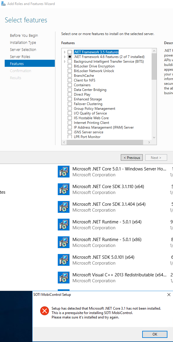 Just got a new server build with Windows Server 2016 and trying to install Soti Mobicontrol. But get .NET Core error even thus is has been installed.