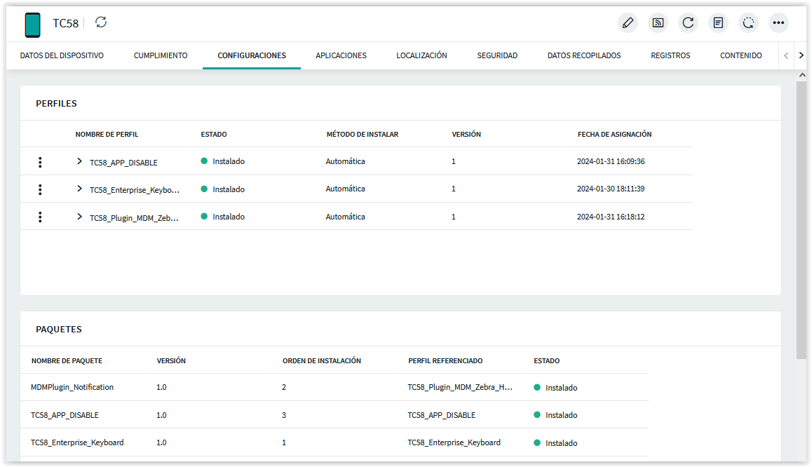 The first problem is that it doesn't load Android Enterprise profiles of the Work Managed type. I have two Android Enterprise Work Managed profiles created and assigned in a folder. When I place the TC58 device in that folder, the profiles are not assigned to the device. I have tried enrollment methods using Stagenow with a configuration JSON for Soti, which I have regularly used for other Zebra models, and manually with afw#mobicontrol. In both cases, the same problem occurs.