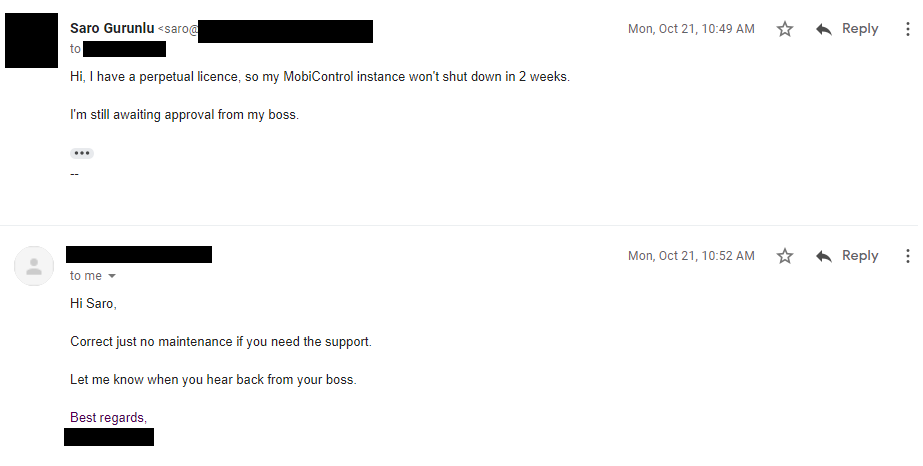 Less than two (2) weeks ago, my boss made the decision to postpone our yearly MobiControl maintenance renewal to December 2019, to coincide with our upcoming purchase and delivery of new trucks & appropriate tablets. Since we're on a perpetual licence, MobiControl will still work as-is, right?