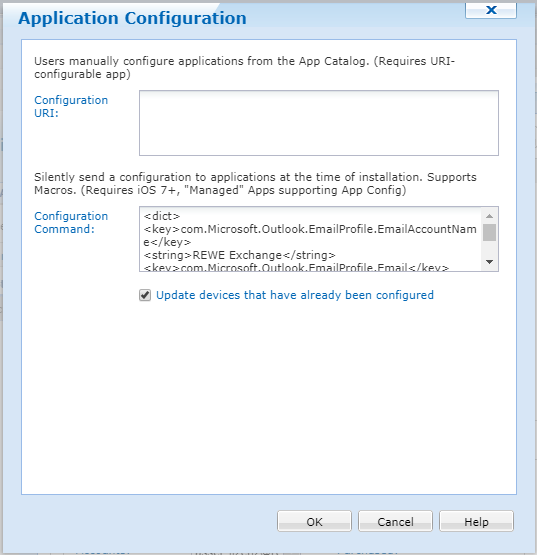 i try to install the outlook app for iOS with an initial konfiguration so that the user only need to enter the password to use the app. i'm using the "configuration command" field and the following XML.