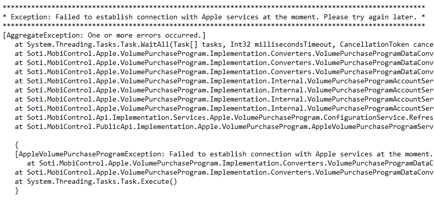 Do you have any B2B apps in your Apple Business Manager assigned to your SOTI VPP instance? If so and you are not running 15.2 or 14.5 of the mobicontrol server then that is the issue. I had a similar issue and was able to clean out those B2B apps to resolve. However my understanding is there is a fix in both 14.5 and 15.2 for this issue.