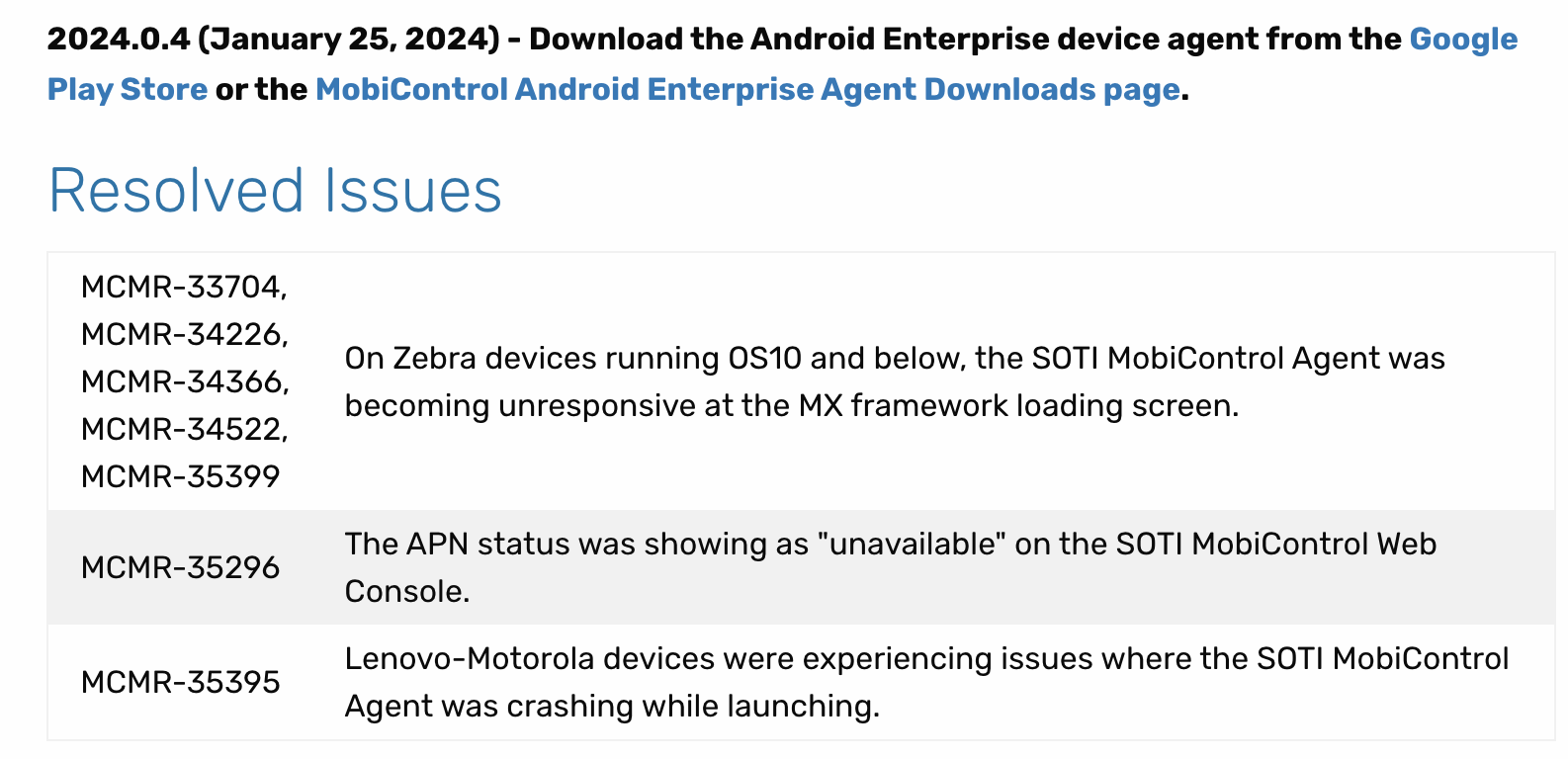 Which i also find strange, at the beginning of the week I saw the releases of SOTI agent version: 2024.0.4.1056, but now it is no longer there. We let the zebra devices automatically install the agent. And we are now at 2024.0.4.1056. Have any bugs been discovered and has the release been pulled back?