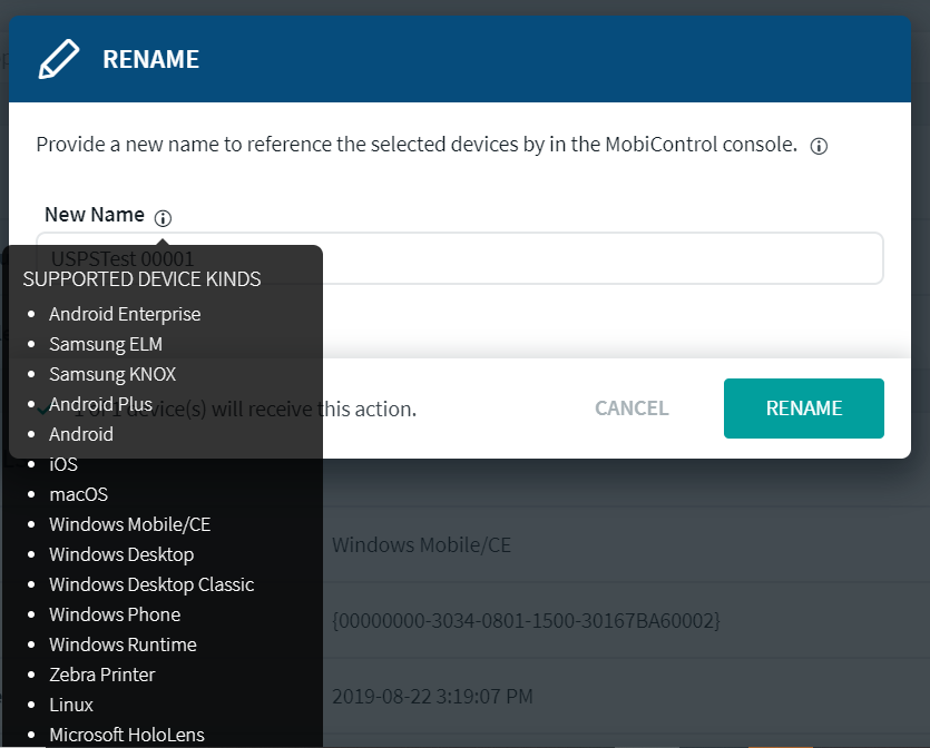 You have the option to rename the Windows CE devices after provisioning. On the MobiControl web-console, click on the device and find 'Rename' option on the Device Actions menu, to land on the below shown window.