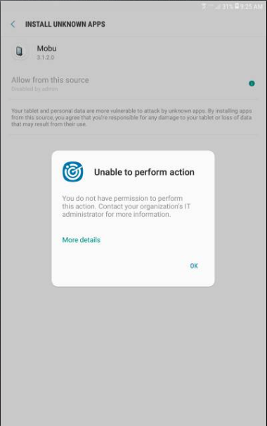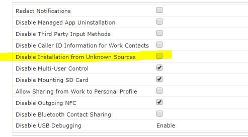 hello, i have two samsung devices enrolled with enterprise and for some reason when i am in the kiosk mode and enter the admin password to unlock the device, i try to allow installs from unknown sources, and it does not let me. i get a message that says please contact your IT administrator. however, when i send "notify kiosk off" script, i am allowed to change it. is there any way i can have it to always allow unknown sources?