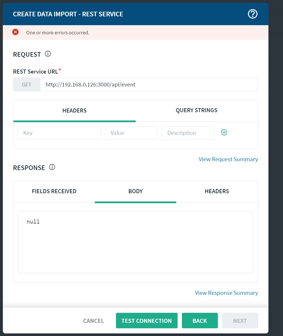 I am trying to build an application using soti snap for the first time. But, i have some technical issue about rest service. When i am using rest service to import some data and test connection the result is null. On the other hand, i have tried my rest url with postman and some of others api test platform it successfully. Any one can help me explain this problem? what is the problem exactly. I attached with the error screenshot.