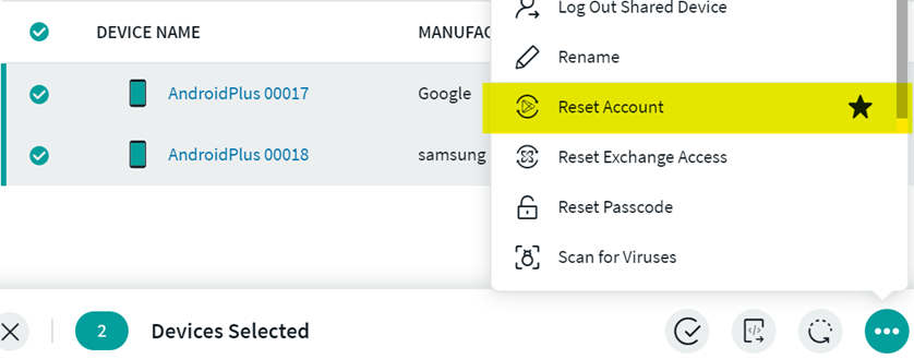 2. Select all applicable devices and then use the "Reset Account" device action.