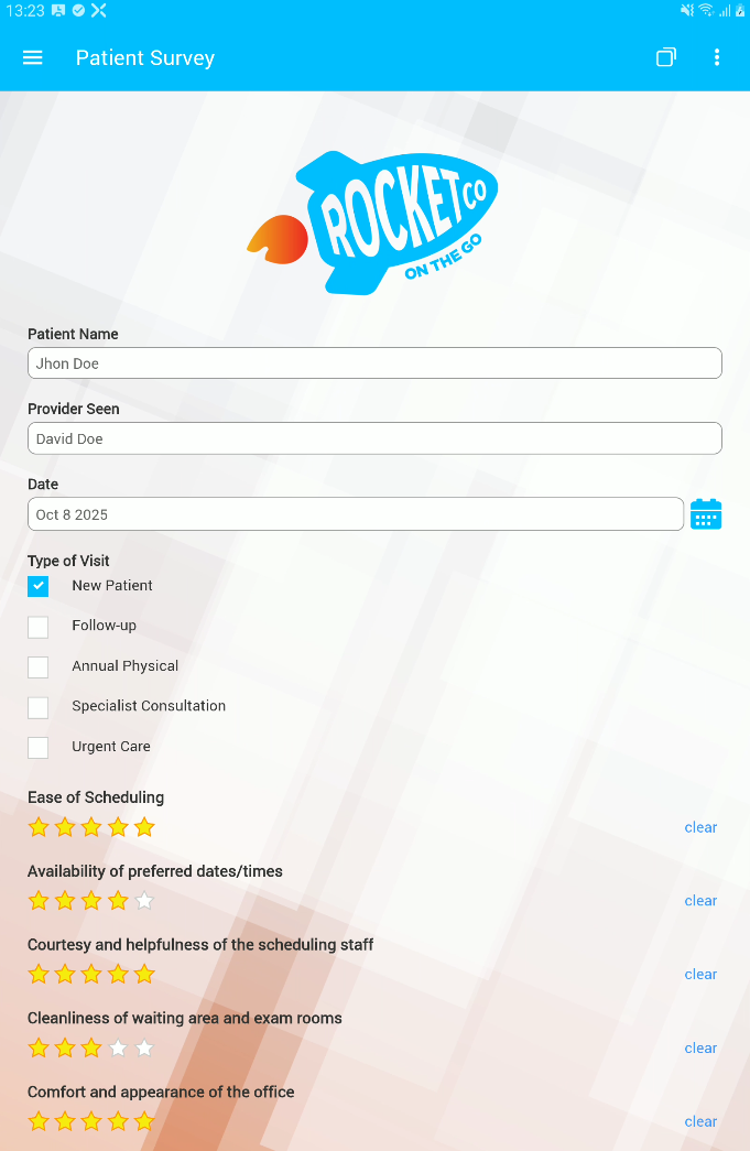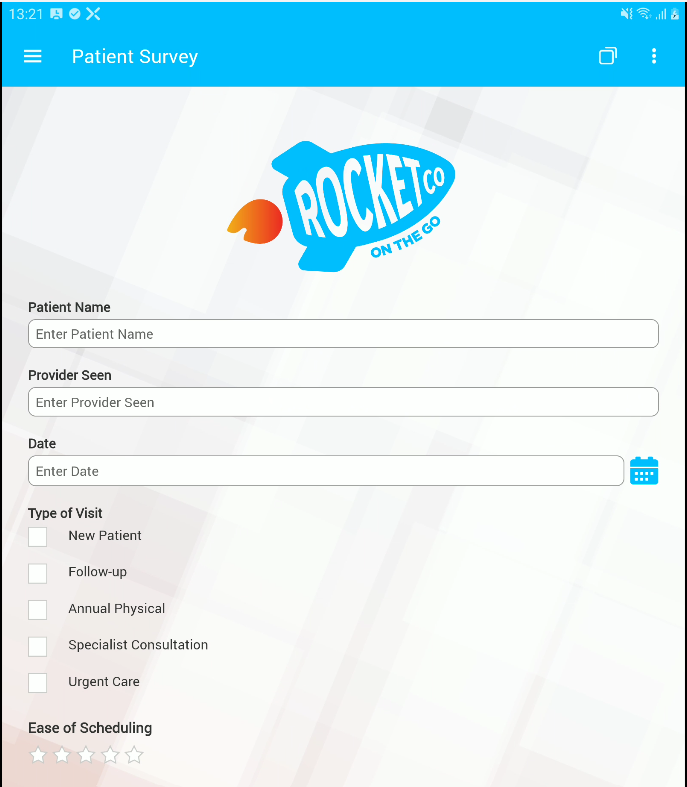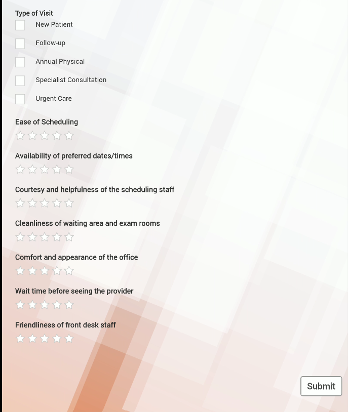 A patient experiences survey app designed to gather feedback from individuals following their medical visits. The form captures visit details such as patient name, provider seen, date of visit, and type of appointment. It also includes a series of rating-based questions covering aspects like scheduling ease, staff courtesy, office cleanliness, and wait times. Ideal for healthcare providers seeking to improve service quality.
