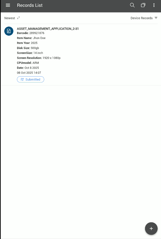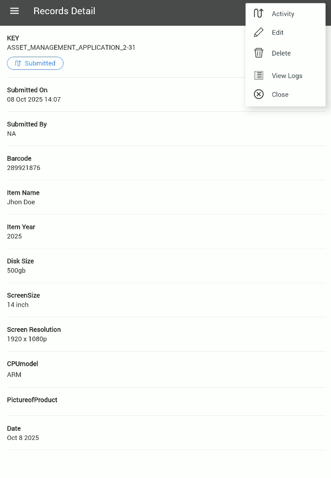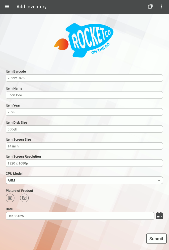 An asset inventory management application designed to streamline the process of logging and tracking physical items. Users can enter key details such as item ID, item name, year of manufacture, and hard disk size. The app includes a dropdown for selecting CPU models, a date picker to record the entry date, and a camera widget to capture product images. Ideal for IT departments.
