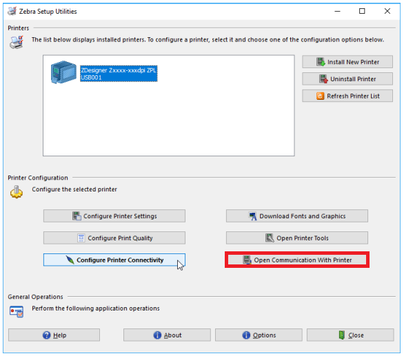 3. Choose the connected printer and open a direct line of communication by selecting Open Communication With Printer.