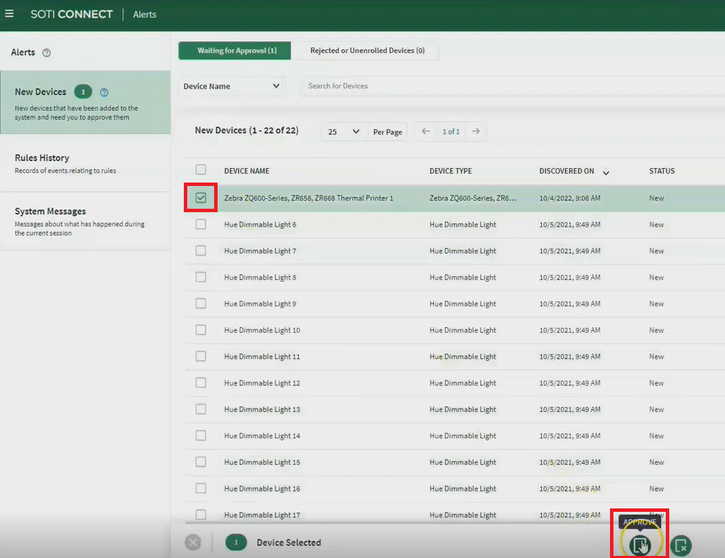 2. Select the discovered device that is awaiting approval and then select Approve to enroll the printer.