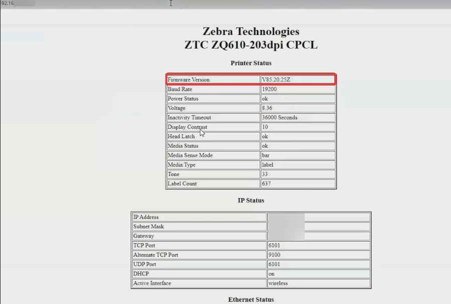 Note: You can check the printer's firmware version by navigating to its IP address in a web browser. If the printer's firmware is not compatible, upgrade the firmware version to a compatible version. Details on upgrading firmware on Zebra printers can be found here.