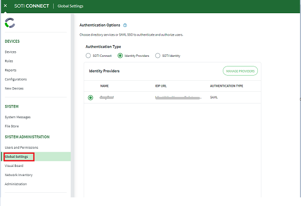 1. On the SOTI Connect web console, navigate to Global Settings from the main menu.
