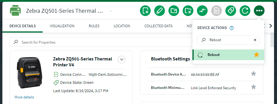As a workaround, the command to Reboot the printer can be performed from SOTI Connect. This will cause the printer to disconnect and reconnect to the MQTT server achieving what is performed by Restart MQTT Connection 1 or Connection 2.