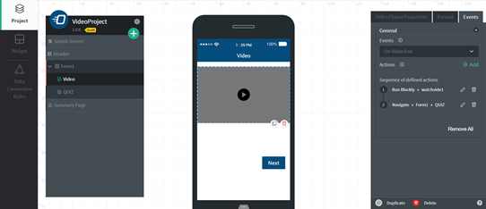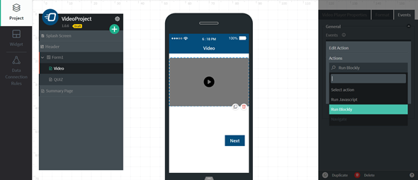 Step 2) Click Events dropdown and select “On Video End” > Click Add action > select Run Blockly > launch the editor.