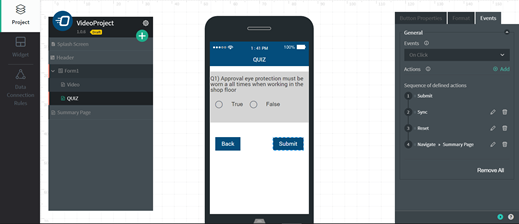 Step 4) Click Events tab > Select on Video End > Add navigate to next page (Quiz).