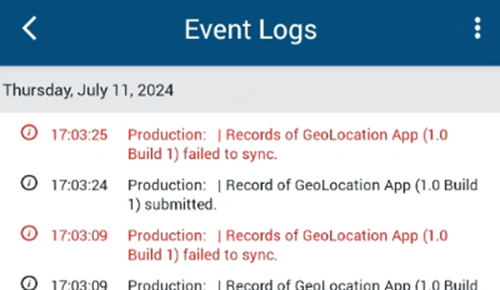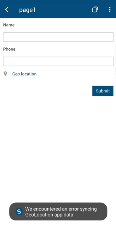 When attempting to submit data from a mobile device for apps using the Geolocation Widget, it fails to sync data to the server and the following error message is displayed: "We encountered an error syncing <App_name> app data."