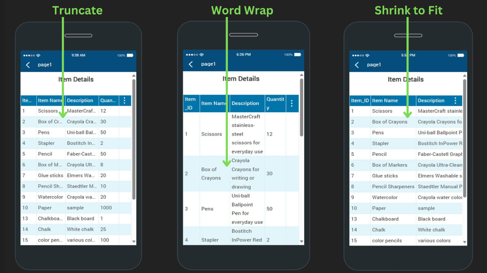 The SOTI SNAP table widget is getting some significant enhancements. You will soon be able to set column widths and define text behavior including word wrap, shrink/stretch the columns to fit, or truncate the text if your user doesn’t need to see the entire content.