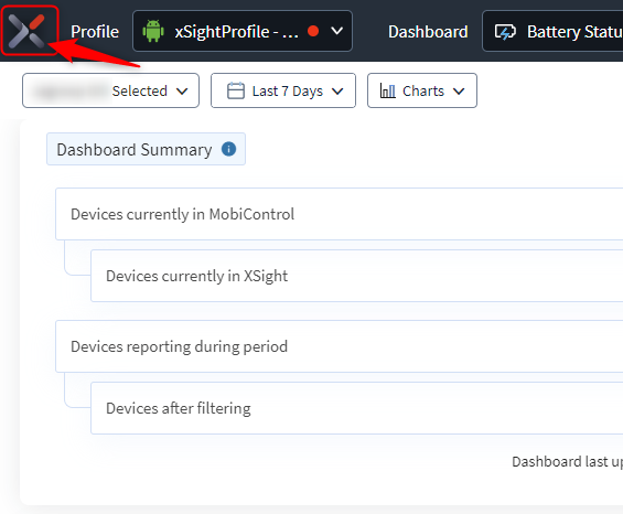 1. Log in to the SOTI XSight web console. Once logged in, select the main menu on the top left.