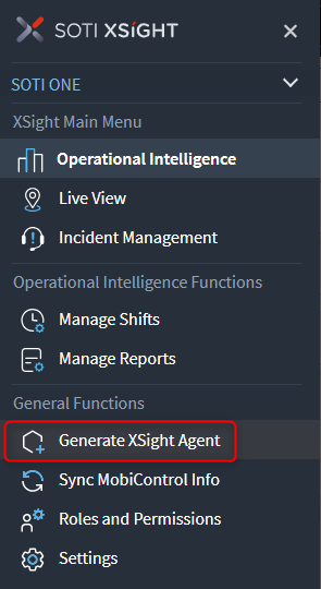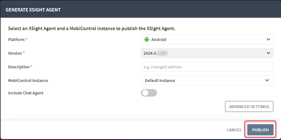 3. A new window will appear. Choose the appropriate platform (Android or Windows) and the SOTI MobiControl instance. The newest SOTI XSight agent version will already be pre-selected.