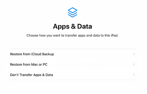 3. Continue through the Setup Assistant until the Apps & Data screen: