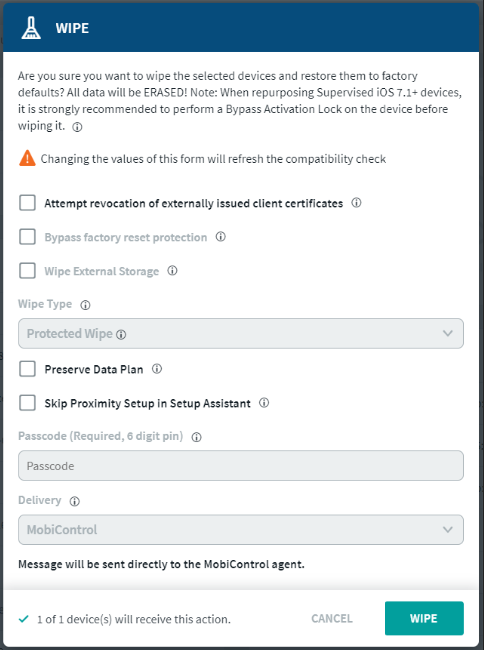 Or, if permitted by MobiControl, the device can wipe itself under Settings > General > Reset > Erase All Content and Settings.